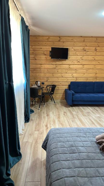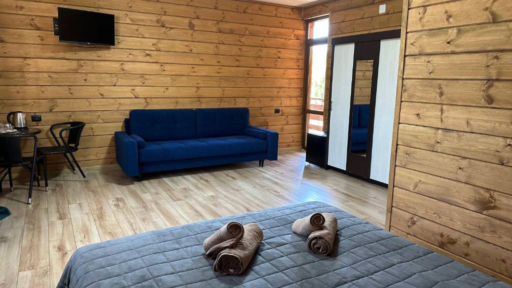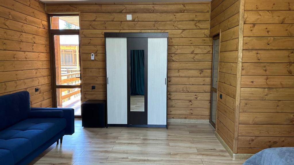 Площадь номера - 35 кв.м. 3 осн. места. 1 доп. место. Мебель: вешалка, диван раскладной, зеркало, кровать двуспальная, стол, стулья, шкаф. Оборудование: кондиционер, сейф, телевизор, холодильник, чайная станция. Санузел: с душем, фен. Сервис: Wi-Fi бесплатно, смена полотенец, смена постельного белья, уборка номера.